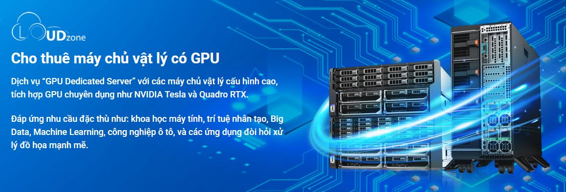 GPU Dedicated Server (Máy chủ vật lý có GPU): Cloudzone cung cấp dịch vụ cho thuê máy chủ vật lý tích hợp sẵn các dòng GPU chuyên dụng hàng đầu như NVIDIA Tesla và Quadro RTX, kết hợp vi xử lý Intel Xeon E5 thế hệ Dual. Hệ thống này đảm bảo duy trì xung nhịp tối đa, rút ngắn hàng nghìn giờ training mô hình AI và render phức tạp.