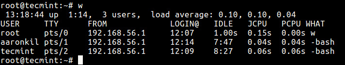 Để nhìn thoáng qua các người dùng đang làm gì trong hệ thống, chúng ta sử dụng câu lệnh w như dưới đây