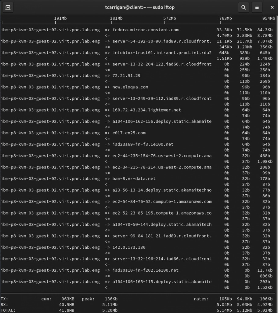 [root@client ~]# dnf install iftop Last metadata expiration check: 0:01:45 ago on Thu 08 Oct 2020 06:22:52 PM EDT. Package iftop-1.0-0.23.pre4.fc32.x86_64 is already installed. Dependencies resolved. Nothing to do. Complete!