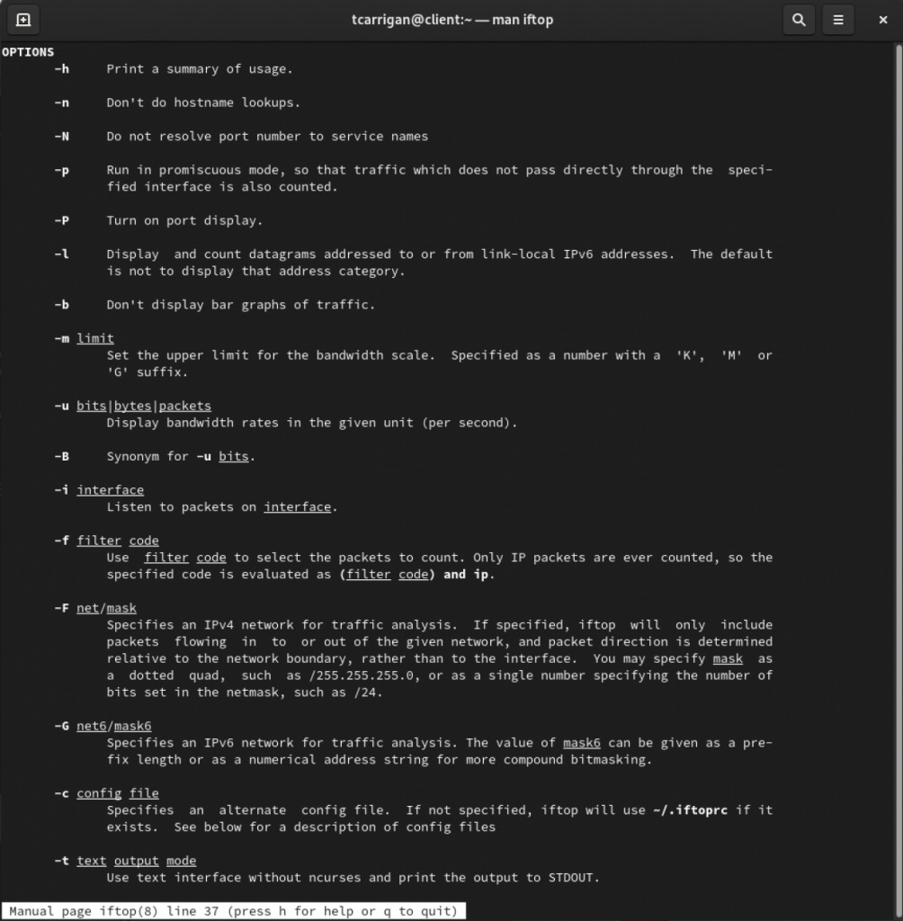 Nếu bạn cần tìm hiểu thêm về iftop, bạn gõ lệnh sau để xem toàn bộ hướng dẫn cũng như tham số của câu lệnh iftop