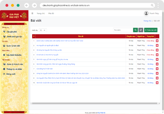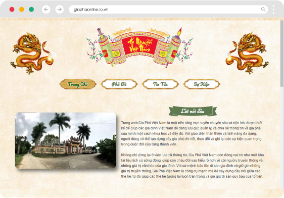 Dùng thử ngayGia Phả Đại Việt Online là phần mềm do Cloudzone phát triển. Một giải pháp trực tuyến đột phá giúp các gia đình Việt Nam dễ dàng lưu trữ, quản lý và chia sẻ thông tin gia phả. Với giao diện thân thiện và tính năng mạnh mẽ, phần mềm cho phép người dùng tạo dựng cây gia phả chi tiết, theo dõi các sự kiện quan trọng và bảo tồn di sản văn hóa của gia đình. Với sứ mệnh kết nối các thế hệ và giữ gìn truyền thống gia đình một cách hiệu quả và tiện lợi.