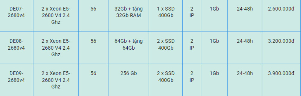 – DE08: Giá chỉ 3.200.000 vnd/ tháng (Tặng máy chủ khi thanh toán chu kỳ 15 tháng).