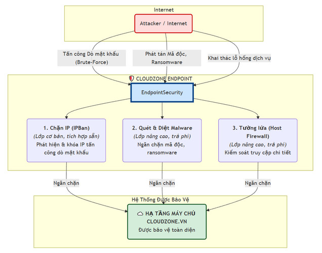 Tất cả các máy chủ tại Cloudzone.vn đều được trang bị sẵn một lớp bảo vệ endpoint cơ bản thông qua IPBan. Công cụ này tự động giám sát và khóa các địa chỉ IP đang cố gắng tấn công dò mật khẩu vào máy chủ của bạn. Đây là tuyến phòng thủ đầu tiên trên chính máy chủ, thiết yếu giúp ngăn chặn phần lớn các cuộc tấn công dò quét mật khẩu tự động từ Internet.