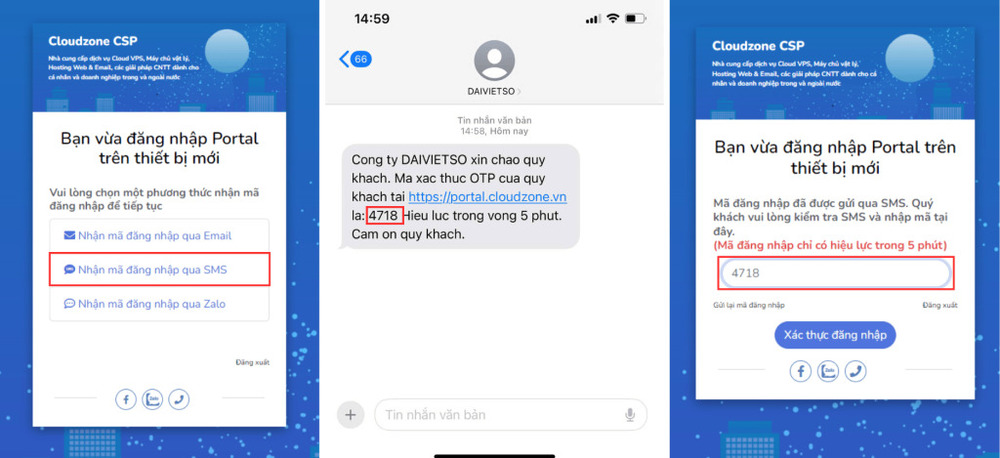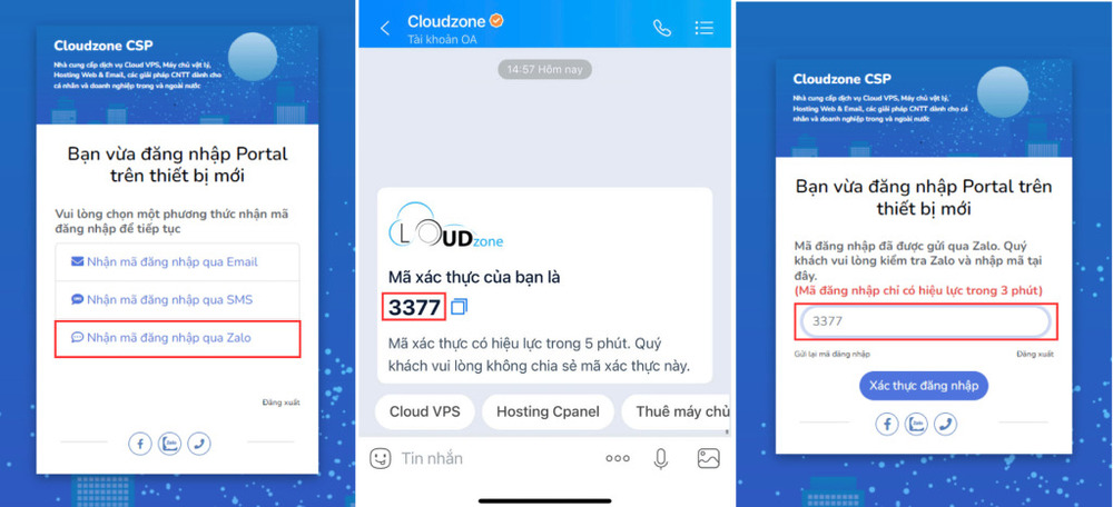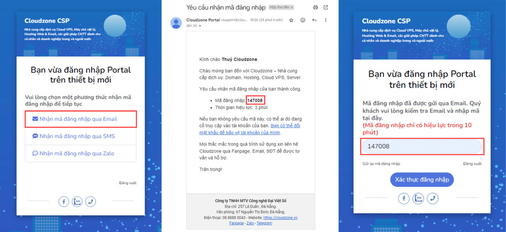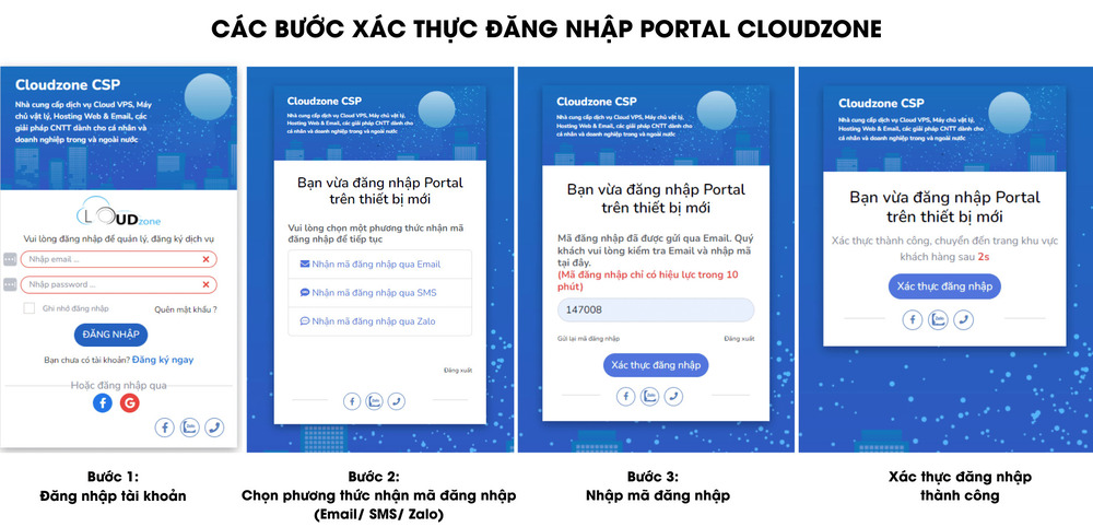 | Các bước xác thực đăng nhập Portal Cloudzone |