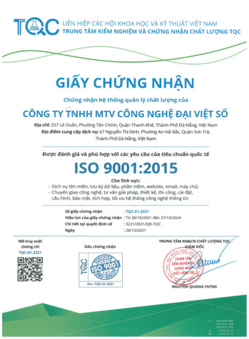 Đây là chứng nhận ISO 9001:2015 do Trung tâm Kiểm nghiệm và Chứng nhận chất lượng TCQ – Liên hiệp các Hội Khoa học & Kỹ thuật Việt Nam chứng nhận: