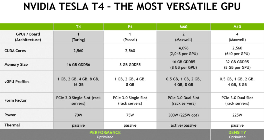 – NVIDIA Tesla T4 không yêu cầu bất kỳ đầu nối nguồn bổ sung nào và mức tiêu thụ năng lượng của nó được đánh giá ở mức tối đa là 70W.