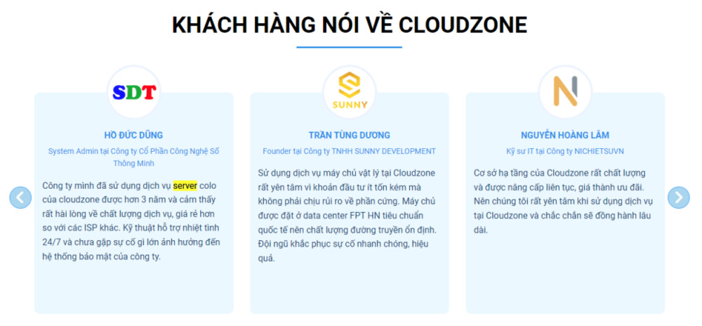 Cloudzone.vn đã nhận được nhiều đánh giá tích cực từ khách hàng về chất lượng dịch vụ thuê chỗ đặt máy chủ (Server Colocation). Khách hàng đánh giá cao sự chuyên nghiệp, hỗ trợ tận tình và giải pháp kỹ thuật hiệu quả mà Cloudzone.vn mang lại.